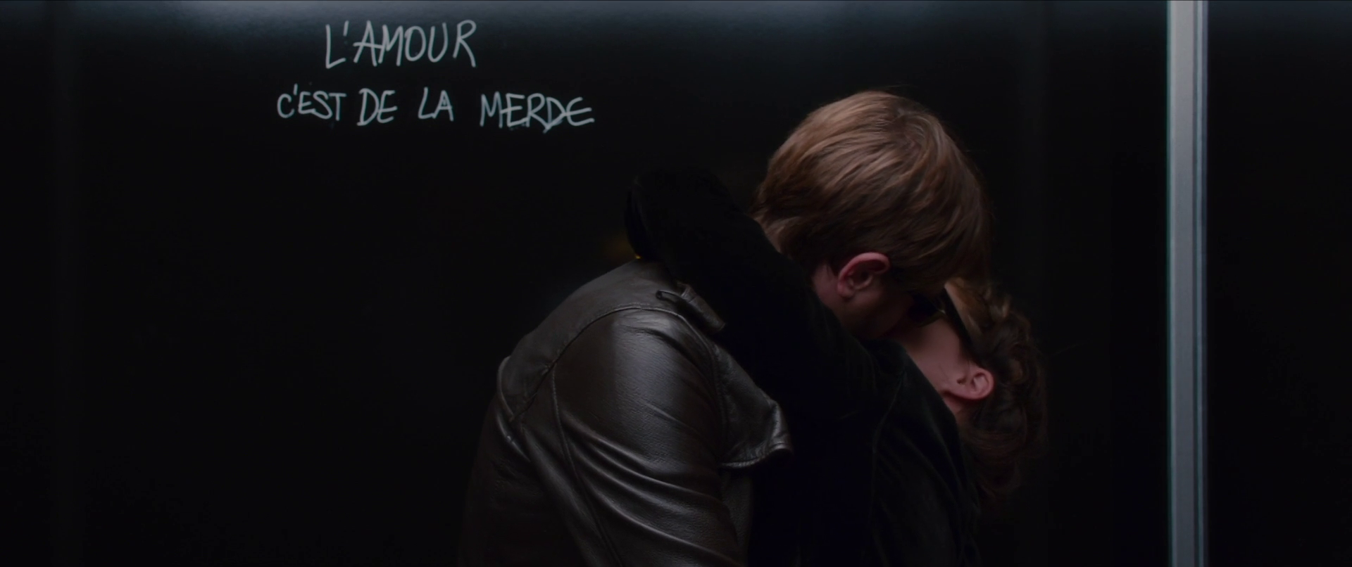 What to make of this? Sincerity placed right alongside, pushed against, really, a calculated artifice. If we are dealing with a romantic comedy, then we must understand how to navigate its codes. The artifice I refer is less of a stylistic one (Ropert does not need exaggerated effects) but rather one of the world itself. There is invention at every turn. Consider the elevator. Here is an obvious set with its own attendant color scheme and the recurring gag of the text written on the wall. The major characters all congregate here, the two brothers and two sisters, this is where they meet. The relationship begins here as does the deception which triggers the plot. Moreover, it is also the place where the younger brother begins to court, in a frankly ridiculous way, Elise’s sister, by complimenting her earrings. With each return to the elevator the relationship advances, through insults, through compliments, through silence. The elevator becomes a space for fiction.