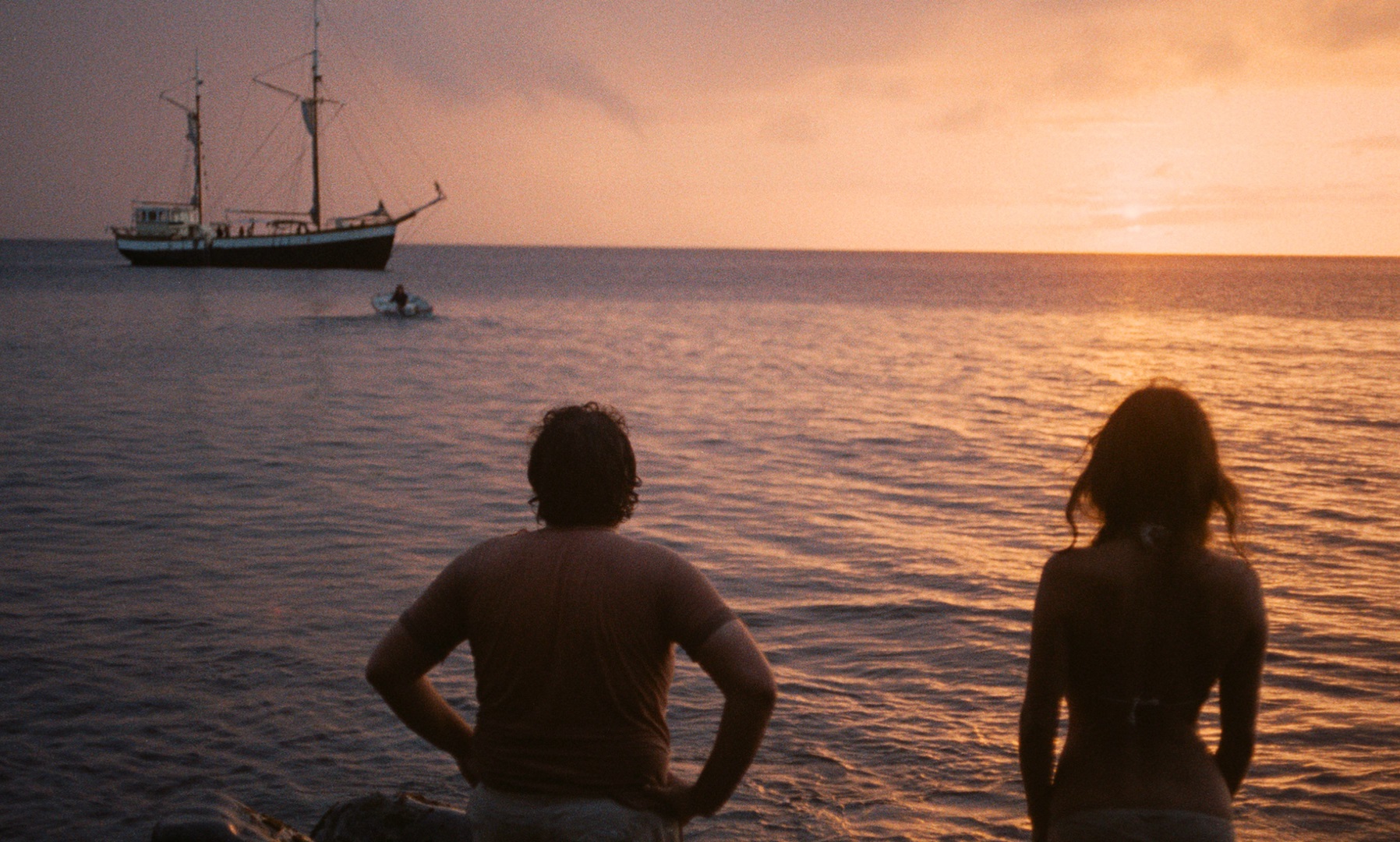 Two constant motifs in the cinema of Rozier: the sea and its elemental interpretation, tropicality. The mambo, samba, and calypso are the music that sustains the frenzy to which Rozier aspires to as a comedian and, at the same time, results in an aural ambience that places the story in a setting of party and leisure. The tropical element in his films is a goal, an exotic port to reach even if one never arrives (the Rozierian narrative consists, perhaps, of never arriving). The life on the beach as a form of subsistence exceeds the plot of Du côté d’Orouët and the subsequent film, The Castaways of Turtle Island, and establishes a pattern that is repeated in one way or another in each film. Sailors, fishermen or vacationers will be the ephemeral companions of each journey. Like a Cousteau without a compass, Rozier explores the maritime life with the perseverance and curiosity of a naturalist who gets fascinated by the species in front of his eyes. Rozier would seem to not conceive cinema without the sea and, probably, does not understand the sea except through cinema.