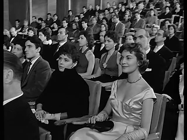 Does freedom require destruction, as Gerardo suggests? Liana must blow up her life, chase after the man who has seduced her, and leave everything behind, all for this idea of freedom that she barely seems to grasp. The second time we see Gerardo is in a shot as he enters the orchestra hall and begins to conduct. The camera follows his movement as he enters and greets the audience before facing the players. The audience settles and the orchestra begins to play. What is the point of view of this shot? At first, we assume it is a somewhat objective shot of the performance, but as soon as the music starts to play we track closer to Gerardo, coming around to his left profile as he conducts, then circling all around to face him, with the audience behind him. Once we see the audience we begin to understand Cottafavi’s purpose. The camera begins to track past Gerardo to head toward the audience, to Liana. The camera stops at her side before a sudden fade to black takes us to a very dramatic shot which looks upward at Gerardo as he conducts. Then it cuts back immediately to Liana at the audience, before pulling back all the way, reversing the original camera movement and taking us back to Gerardo.